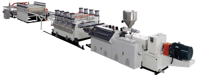 PVC半結(jié)皮(木塑)發(fā)泡板材生產(chǎn)線 PVC發(fā)泡板及木塑發(fā)泡板的應(yīng)用 交通運(yùn)輸業(yè)輪船、飛機(jī)、客車、火車車廂、頂蓬、廂體芯層、內(nèi)部裝璜用板。 建筑裝璜業(yè)建筑物外墻板、內(nèi)裝飾用板、住宅、辦公室、公共場所建筑物隔間、商用裝飾架、無塵室用板、吊頂板、家庭廚柜、吊柜和家居。通過油漆印刷、貼膜和熱壓設(shè)備,可以生產(chǎn)各類仿木制品。 半結(jié)皮(木塑)發(fā)泡生產(chǎn)線 該設(shè)備為發(fā)泡板行業(yè)根據(jù)自由發(fā)泡和結(jié)皮發(fā)泡的特點,采用自由發(fā)泡設(shè)備的擠出部分和結(jié)皮發(fā)泡的定型輔機(jī)部分發(fā)展而來的。具有產(chǎn)品質(zhì)量兼有結(jié)皮發(fā)泡的平整度、自由發(fā)泡設(shè)備的低密度、表面硬度間于結(jié)皮發(fā)泡和自由發(fā)泡之間的特點;另外設(shè)備投資小,接近自由發(fā)泡設(shè)備,利于市場的推廣。