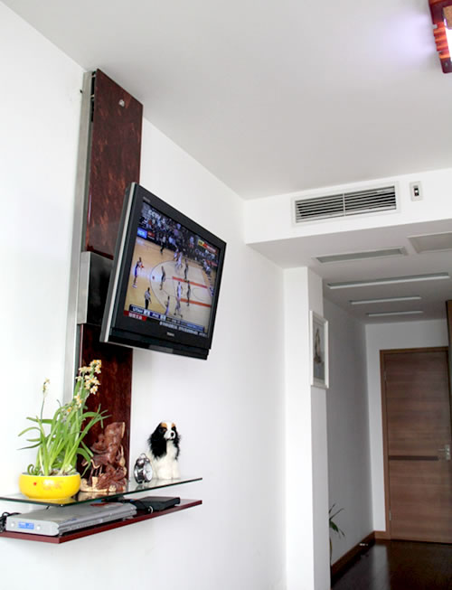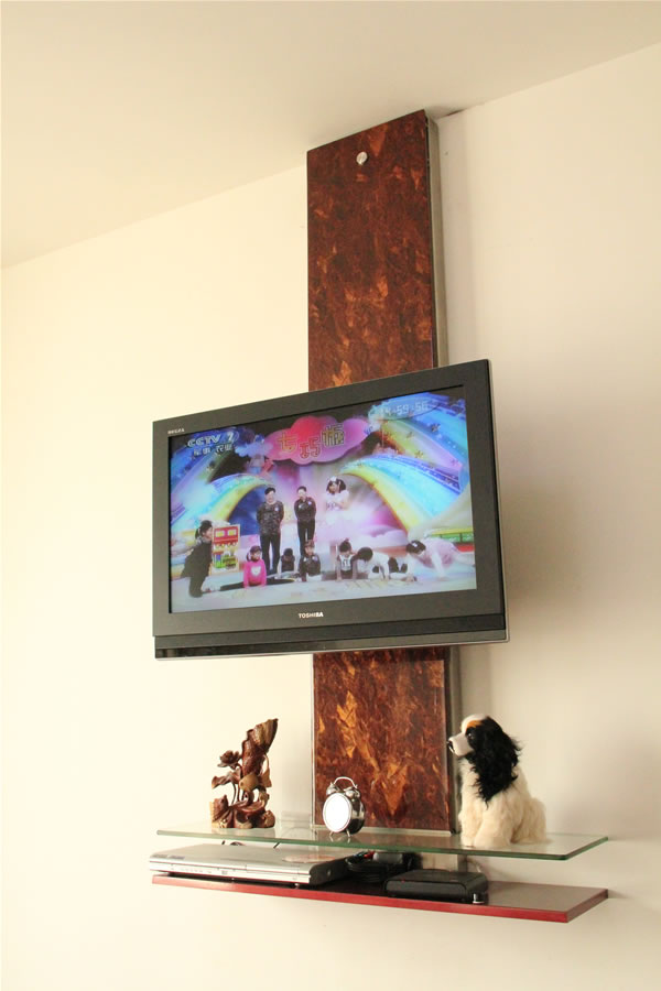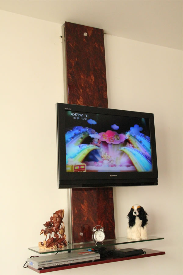 電動遙控電視機(jī)機(jī)架-導(dǎo)軌壁掛式從天花板到地面高度三分之二的墻面上安裝導(dǎo)軌,電視機(jī)架安裝在導(dǎo)軌上,電視機(jī)架在導(dǎo)軌上作垂直上下1100mm的自由升降,任意位置的停留;同時,電視機(jī)機(jī)架可作前后18度的傾斜動作以及左右36度側(cè)向角度調(diào)節(jié)。在導(dǎo)軌下端安裝有精致小巧的嵌入式懸空臺面,材質(zhì)可為玻璃或樹脂板材,可放置DVD,碟片盒,機(jī)頂盒或花瓶等裝飾性小擺件,其優(yōu)點為節(jié)省地面空間,易于打掃。