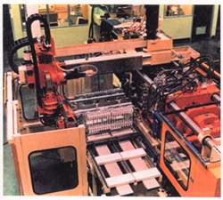 這臺雙軸伺服機械手從80孔腔(2x40)的疊模中取出餐具并放進小盒中。