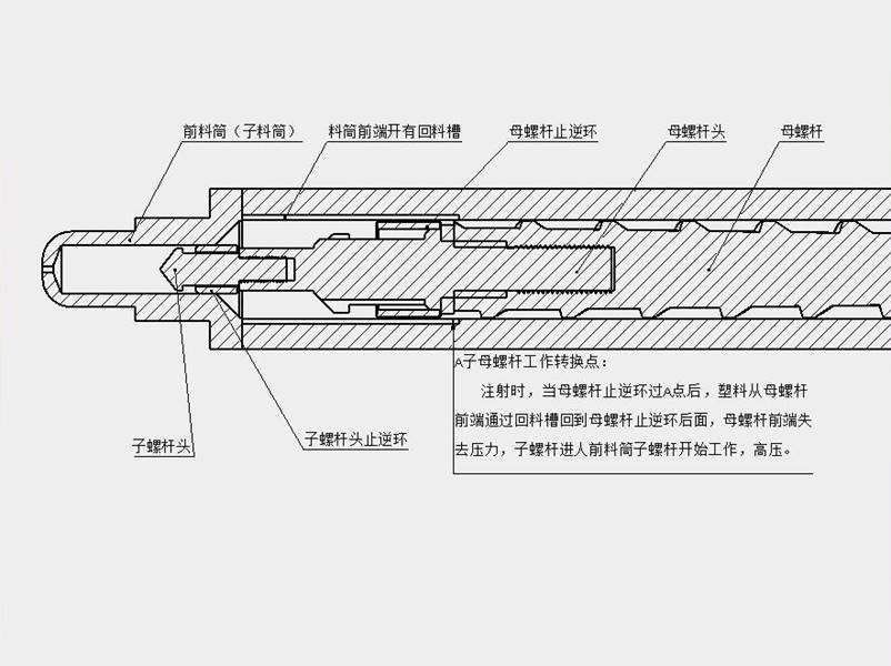 注塑機根據(jù)產(chǎn)品的大小加足相應(yīng)的原料,加料結(jié)束后,開始注射,螺桿向前運動,母螺桿頭上的母止逆環(huán)及子螺桿頭上的子止逆環(huán)滑向后端并閉合母螺桿頭上的進(jìn)料通道,塑料在螺桿的推動下從前料筒的噴嘴射入模具,此時模腔注射壓力不用太高,當(dāng)塑料快沖人模腔注射壓力會慢慢升高,注射到最后階段時,子螺桿頭進(jìn)入前料筒同時母止逆環(huán)后端移動到回流槽的通道口(A點是母螺桿與子螺桿工作的轉(zhuǎn)換點),塑料從回流槽繞過母螺桿止逆環(huán)到其后端,母螺桿頭的前端失去壓力,此時子螺桿頭在前料筒中起作用,因子螺桿頭的端部面積可以做得比母螺桿頭的端部面積小很多(根據(jù)實際需要端部面積可以做到小達(dá)幾倍,相應(yīng)的產(chǎn)生的壓力也可以是母螺桿頭產(chǎn)生的壓力的幾倍,一般模腔壓為250300cm²/kg),所以模腔壓力是高壓,也可以是超高壓每平方厘米在一千公斤以上,可以滿足任何塑料產(chǎn)品的要求(用昂貴的氣體輔助注射設(shè)備最高也只能到每平方厘米700公斤),靈活調(diào)節(jié)注塑機電腦控制最后一段注射和一級二級保壓壓力,加工出來的塑料產(chǎn)品可以做到無縮印,高品質(zhì),高密度,高強度。